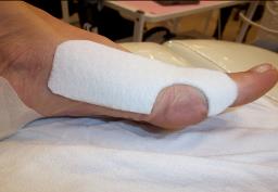 Dit is een voorbeeld van een wondje die ontstaan is door te smalle schoenen. De teen is drukvrij gelegd d.m.v. vilttherapie. Als dit wondje niet goed geneest, kan dat grote gevolgen hebben voor mensen met diabetes mellitus of mensen met doorbloedingsproblemen.